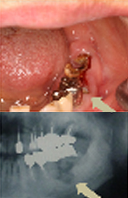 骨粗鬆症の治療や固形癌の骨転移や多発性骨髄腫など、さまざまな疾患への臨床応用が広がっている薬剤の使用によって顎骨壊死が生じた状態。